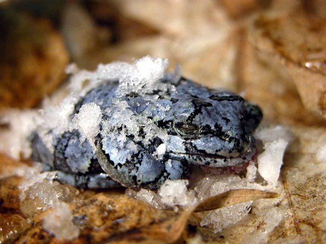 During winter they freeze themselves, keeping themselves warm by stopping their heartbeats and producing an antifreeze substance that prevents the ice from getting frozen within the cells. Once the temperature rises, they thaw and come back to life.
