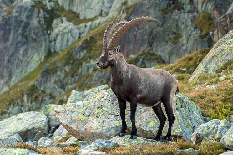 Alpine ibex is a wild goat that inhabits the European Alps, occurring at an elevation of 5,900 to 10,800 ft. Although the herbivorous species was extirpated from most of its historical range, it was successfully reintroduced to those regions. All living individuals today are descendants of the stock from Gran Paradiso National Park in Italy and Maurienne valley in France.