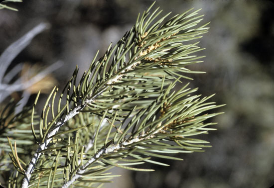 | Identification | Leaves (Needles): Green, 1.2-2.2 inches long, occur in pairs, moderately stiff, stomata on both the outer and inner surfaces Cones: Egg-shaped, 1.5-2 inches long, reddish-brown, scales are few and not covered with prickles; thin-shelled, edible, large and wingless seeds Bark: Reddish brown, thin, scaly, rough |