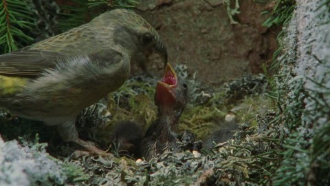 Nests are built by the female crossbills and are located on horizontal branches higher up in coniferous trees. The nest comprises of grass, twigs, and barks strips and is lined with lichen, feathers, grass, and hair.