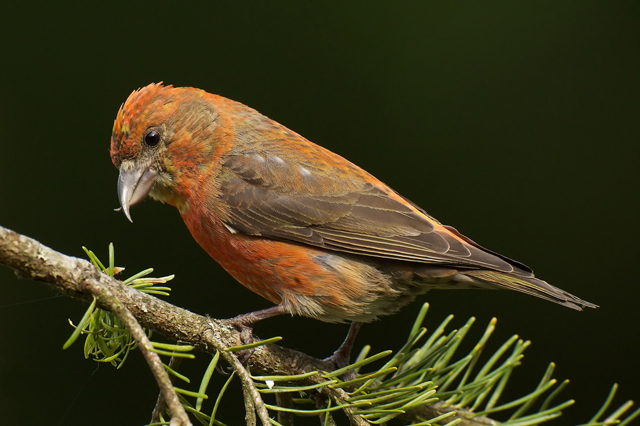 Red Crossbills are small passerine birds, belonging to the finch family, found in North America, Europe and Asia. Although these small birds possess distinctive crossed bills, they exhibit variations geographically in terms of vocalization as well as size and shape of the bill.