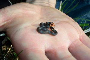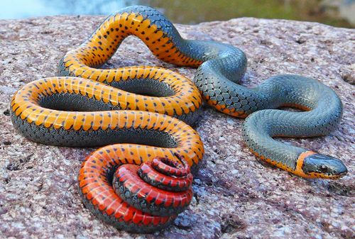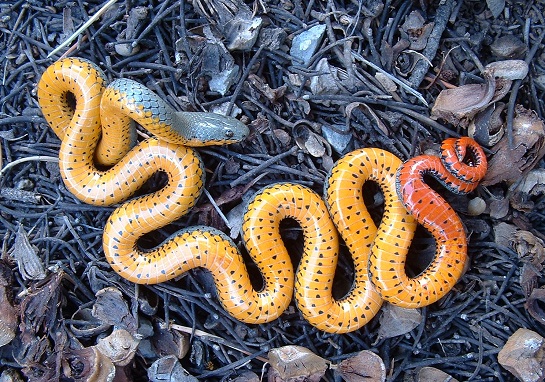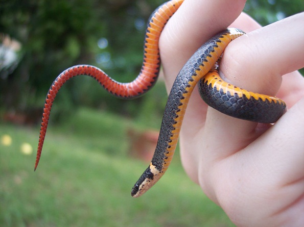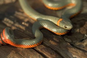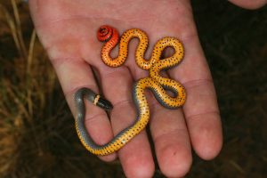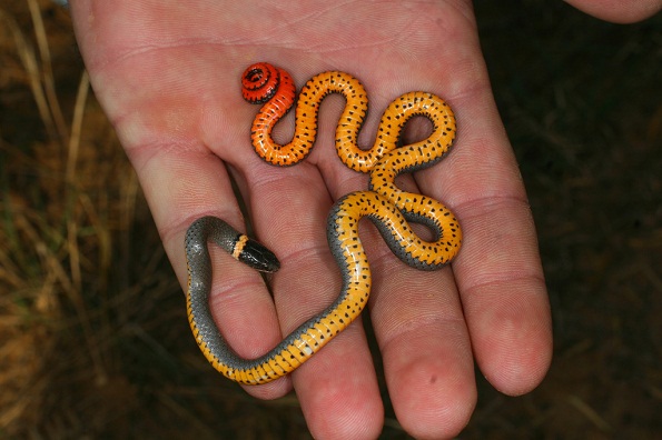 When in danger, ring-necked snakes with orange-red posterior raise their coiled tails toward the predators to warn them of their toxicity.