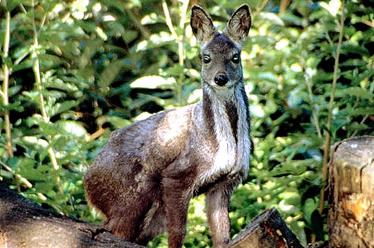 The Siberian musk deer is a species of small, stocky musk deer living in the forested mountainous regions of Northeast Asia. With a kangaroo-like face, long, muscular hind legs, shorter and weaker forelimbs, small chest, highly arched back, and large rear, these animals move in a sequence of coordinated jumps. Unlike other deer species, the male Siberian musk deer do not have antlers but grow fangs during the breeding season.