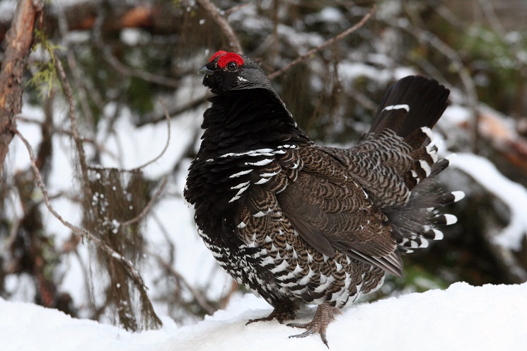 The spruce grouse is more of a walker than a flier, flying only for short distances, generally from one tree to another.