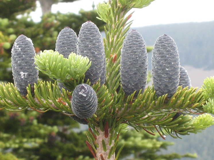 | Identification | Leaves (Needles): 1 in (2.54 cm) long, flattened, thick in the middle, whitish blue sheen across all surfaces; rounded tips, some may be notched; arranged spirally, uniformly swept up, manicured appearance Fruits (Cones): 2-4 in (5-10 cm) long, slender, cylindrical, upright on the twigs usually in clusters, deciduous scales; cones purple at maturity Bark: Covered with resin-blisters, grayish green color when young; turns gray to white as it matures, continuous other than the base of larger trees; pockets of resin blisters found throughout the inner bark |