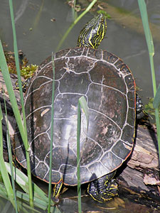 The western pond turtle is a small to medium freshwater turtle, found in ponds and streams. This reptile is generally brown or black in color on the upper shell and yellow and black on the lower one. They are found in the western coast of the United States and Mexico. The Canadian Species at Risk Act drafted in May 2002 has identified this turtle as having become extirpated in Canada.
