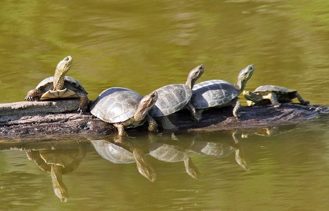 The members of this species assemble in places with logs, boulders and fallen trees for basking. It exposes them to sunlight that helps them get rid of parasites. Western pond turtles of the northerly areas hibernate at the bottom layers of ponds or inside burrows in the mud. However, the turtles inhabiting the southern areas stay active all through the year.
