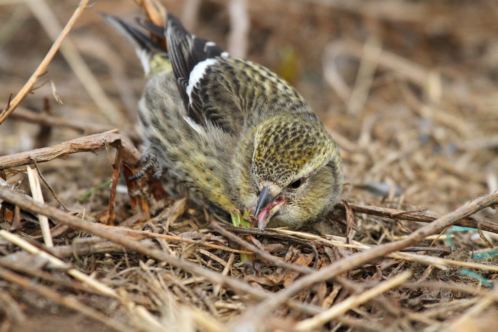 Juvenile crossbills have a brown coloration with prominent white streaks. They leave the nest within 21-25 days.